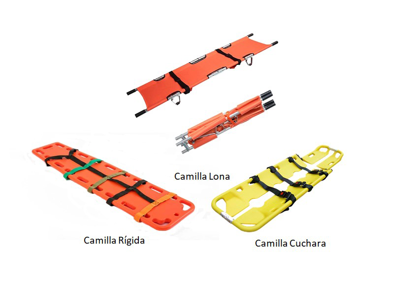 También suministramos, los elementos más usuales, como camillas rígidas, de izado, flexibles, plegables, etc… y el resto de elementos para la fijación del herido en la camilla y su sujeción, inmovilizador de cabeza, de cuello, etc.